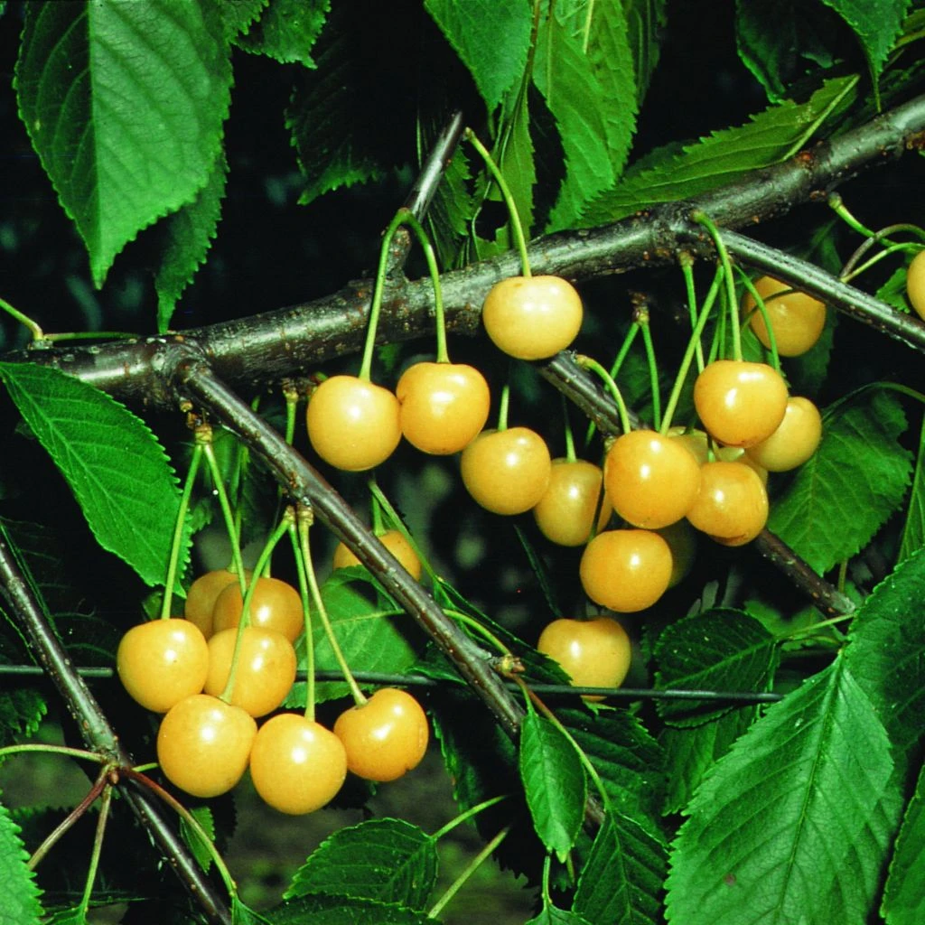 Le Cerisier ‘Bigarreau Stark Gold’ produit de jolis fruits à peau et chair jaune, on dit que cette particularité le rend moins attractif pour les oiseaux. La peau résiste à l’éclatement, c’est un beau fruit appétissant et original, à déguster cru au pied de l’arbre ou en salade de fruit. La récolte tardive a lieu à partir de la mi-juillet mais s’étale en fonction des besoins car les fruits peuvent rester sur l’arbre quelques temps sans s’abîmer.